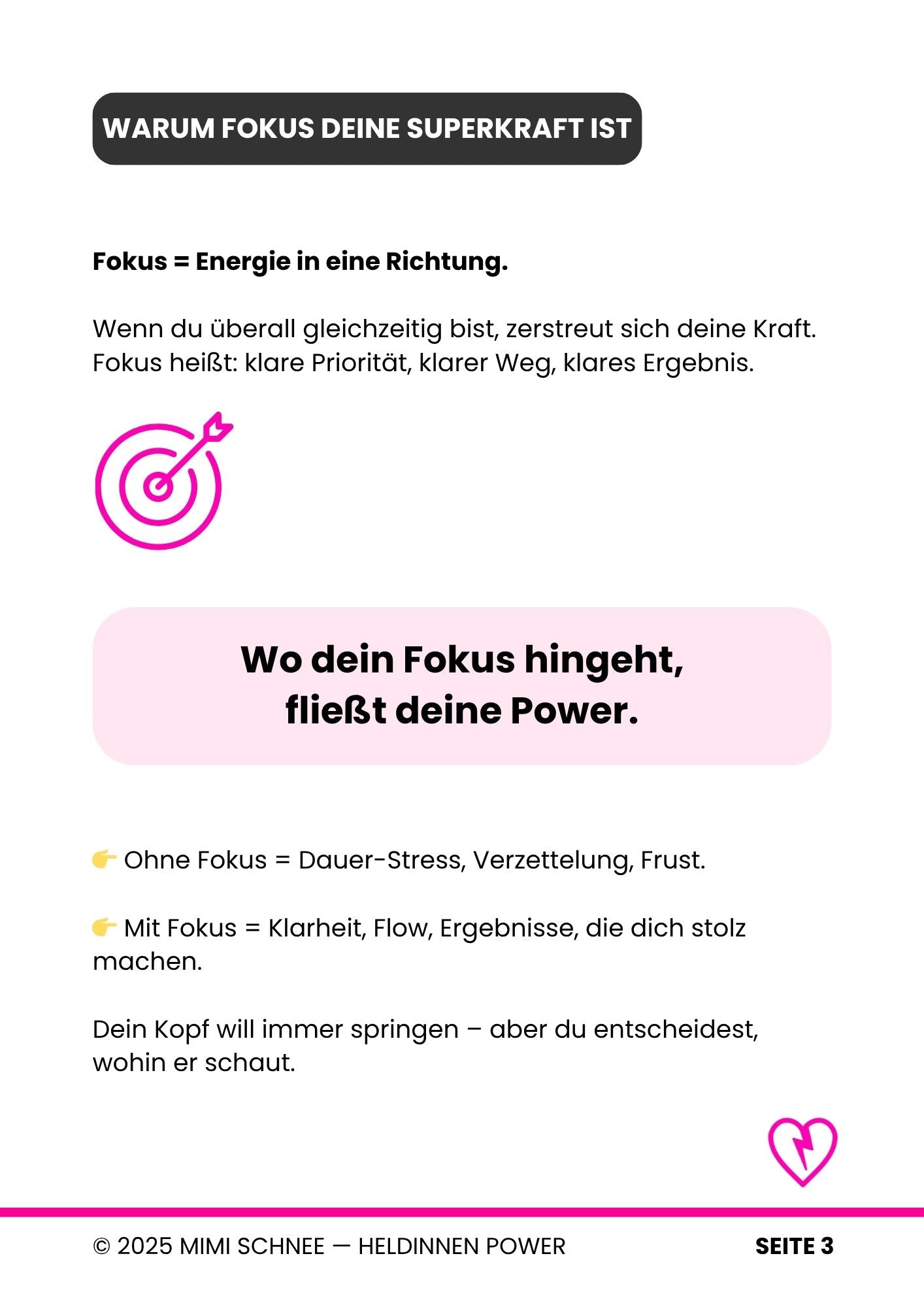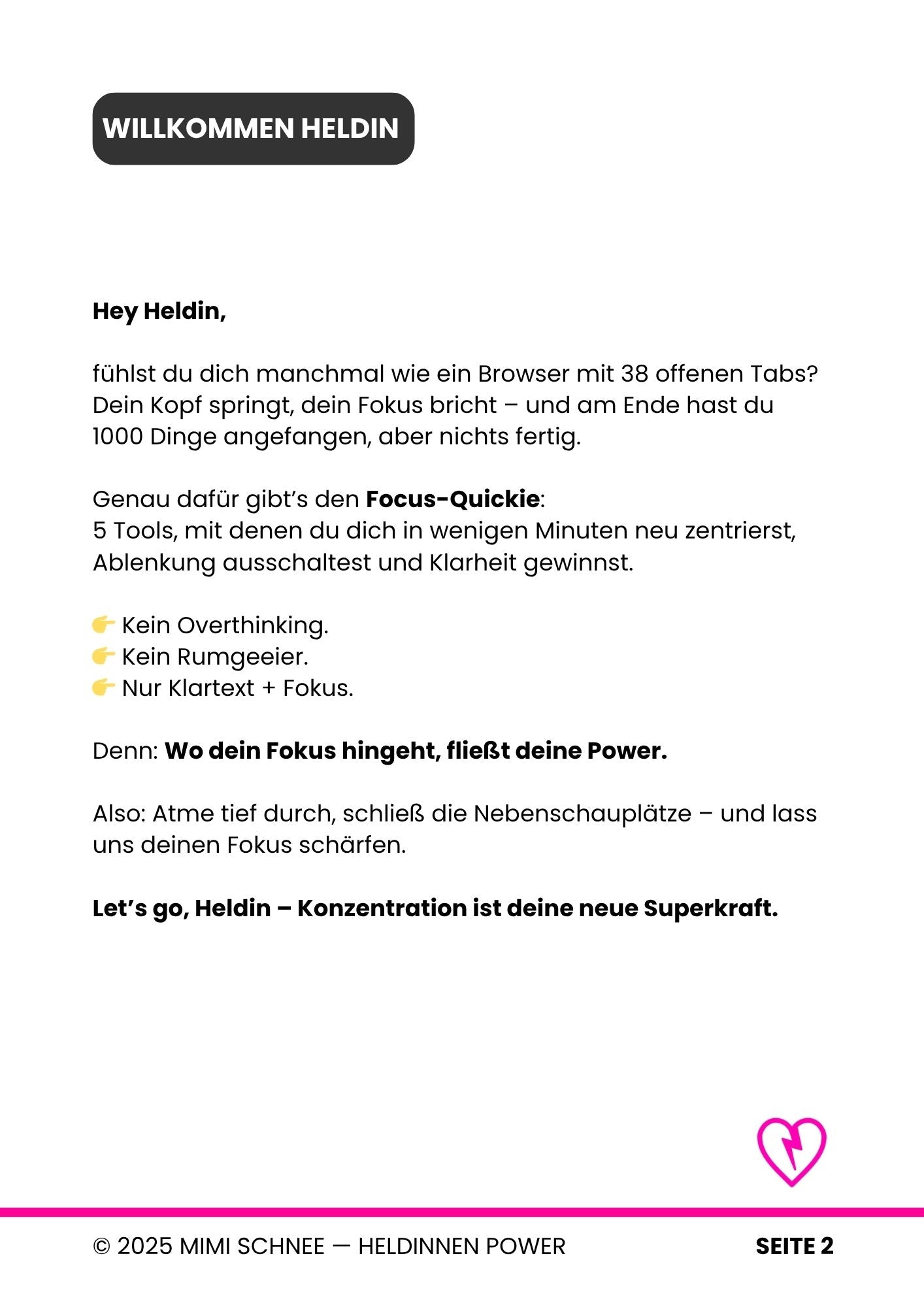 Genau dafür gibt’s den Focus-Quickie: 11 Seiten mit 5 Tools, die dich in wenigen Minuten zurück in deine Klarheit bringen.