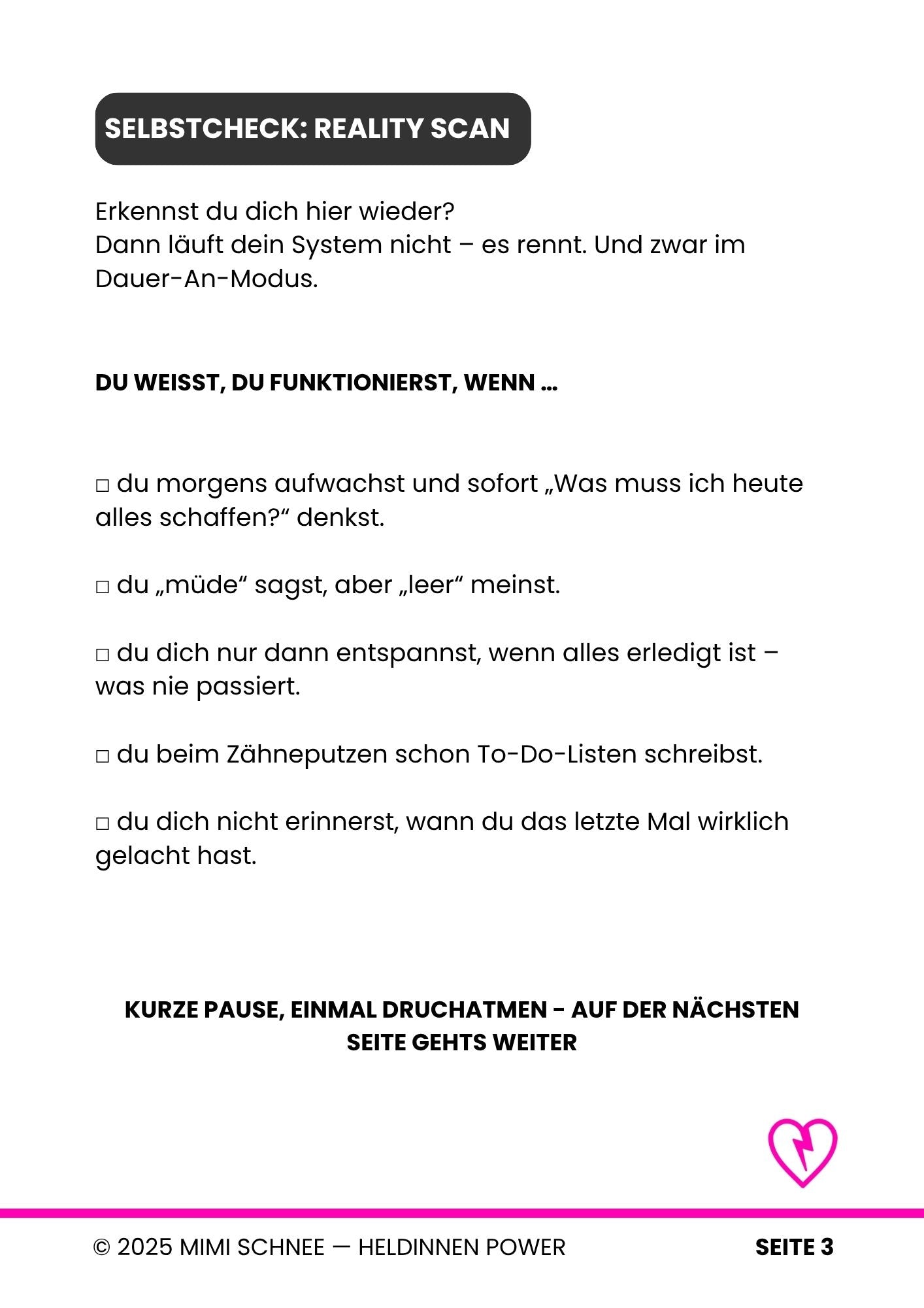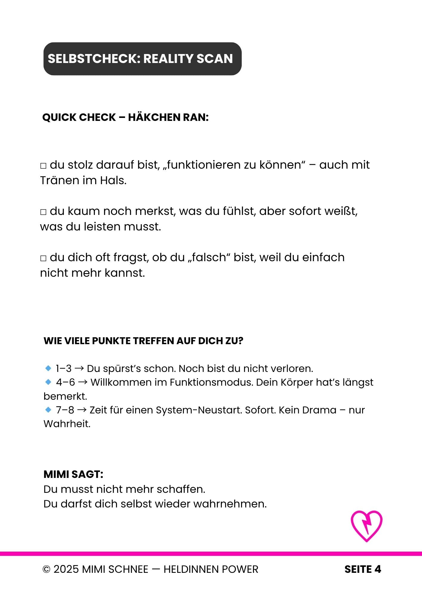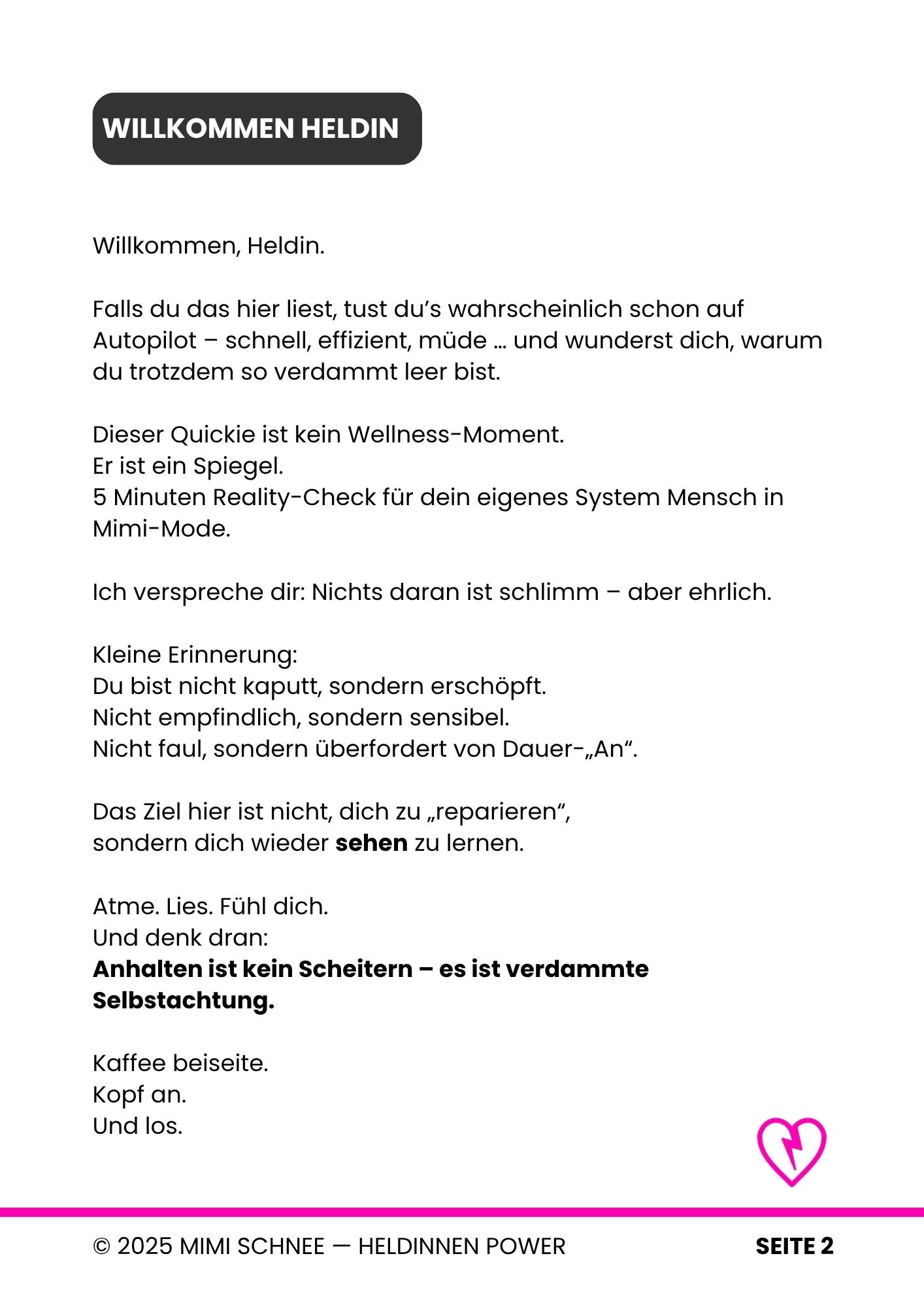 - Wenn du dich manchmal einfach nur leer, erschöpft oder überfordert fühlst: Ja!Die Mimi Schnee Workbooks sind gemacht für echte Heldinnen, die neue Kraft, Klarheit und Mut tanken wollen – ganz ohne spirituellen Zuckerguss, dafür mit Herz und Haltung.