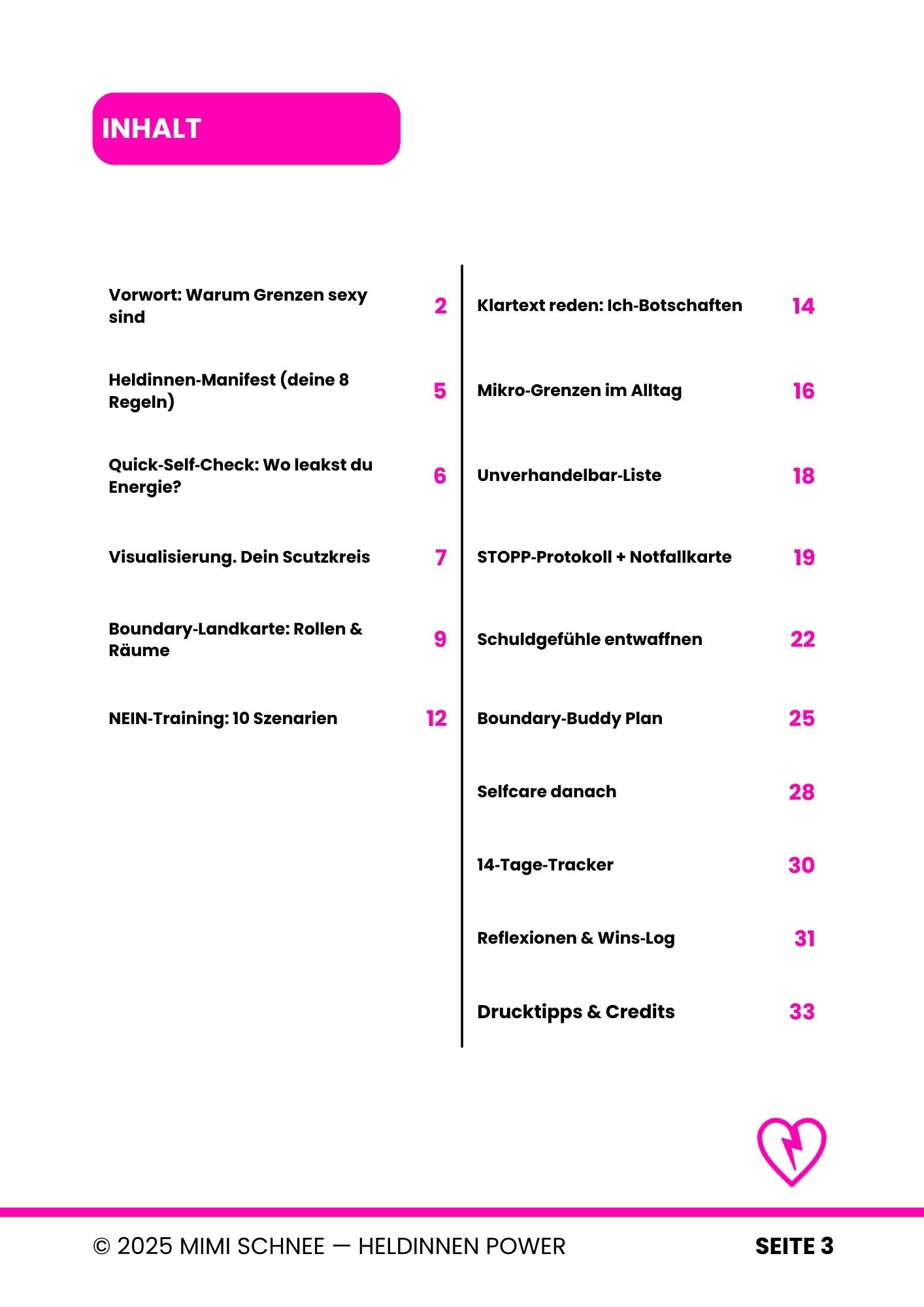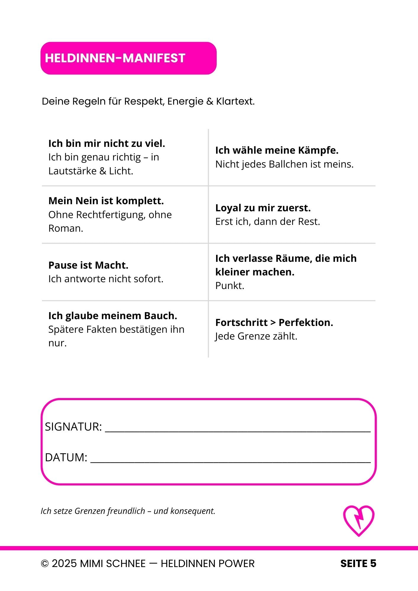7-Tage-Workbook für klare Grenzen. Nein-Skripte, Schutzkreis, STOPP-Protokoll & Tracker. Druckfreundlich & frech. Jetzt downloaden.