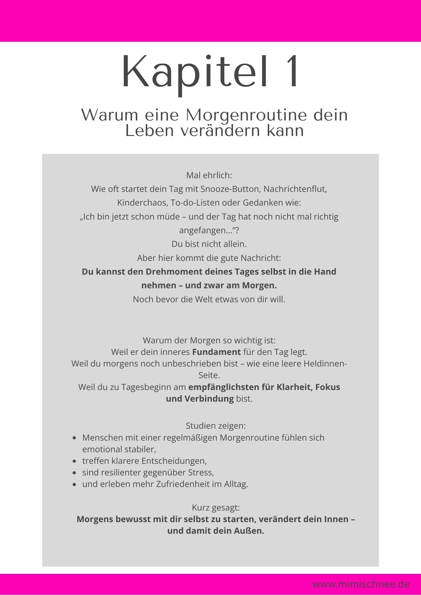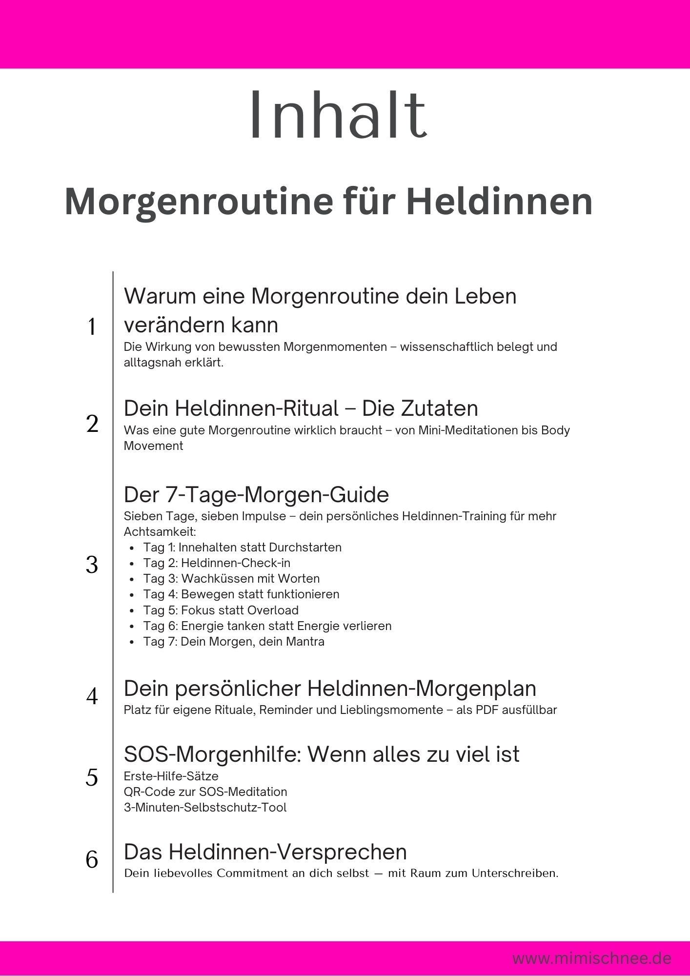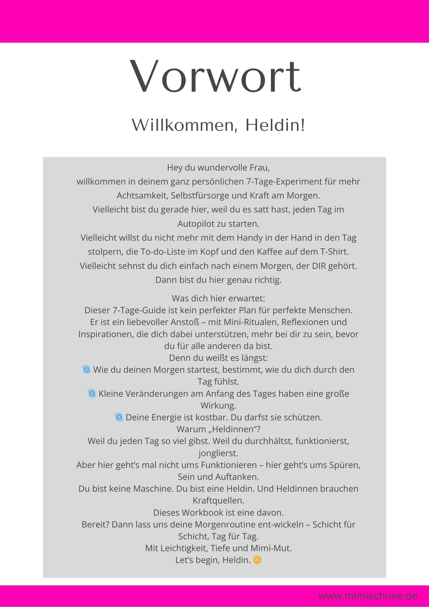 Dieses Workbook ist dein liebevoller 7-Tage-Guide für eine Morgenroutine, die wirklich zu dir passt. Kein starrer Plan, kein Perfektionsdruck – sondern kleine, machbare Mini-Rituale, Reflexionen und Inspirationen, die dich stärken, bevor du wieder für alle anderen da bist.