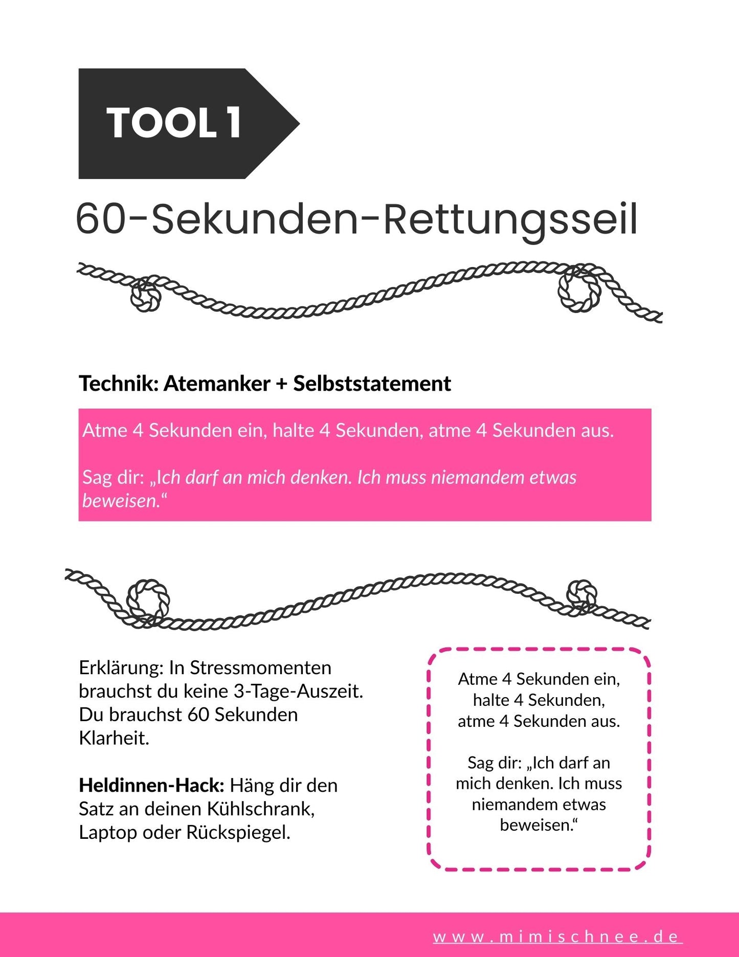 Dieses Workbook ist dein Notfallkoffer für Tage, an denen alles zu viel wird. Kurz, knackig und direkt umsetzbar. Keine langen Theorien, keine endlosen Seiten – nur pure Power, die dich sofort zurück in deine Kraft bringt.